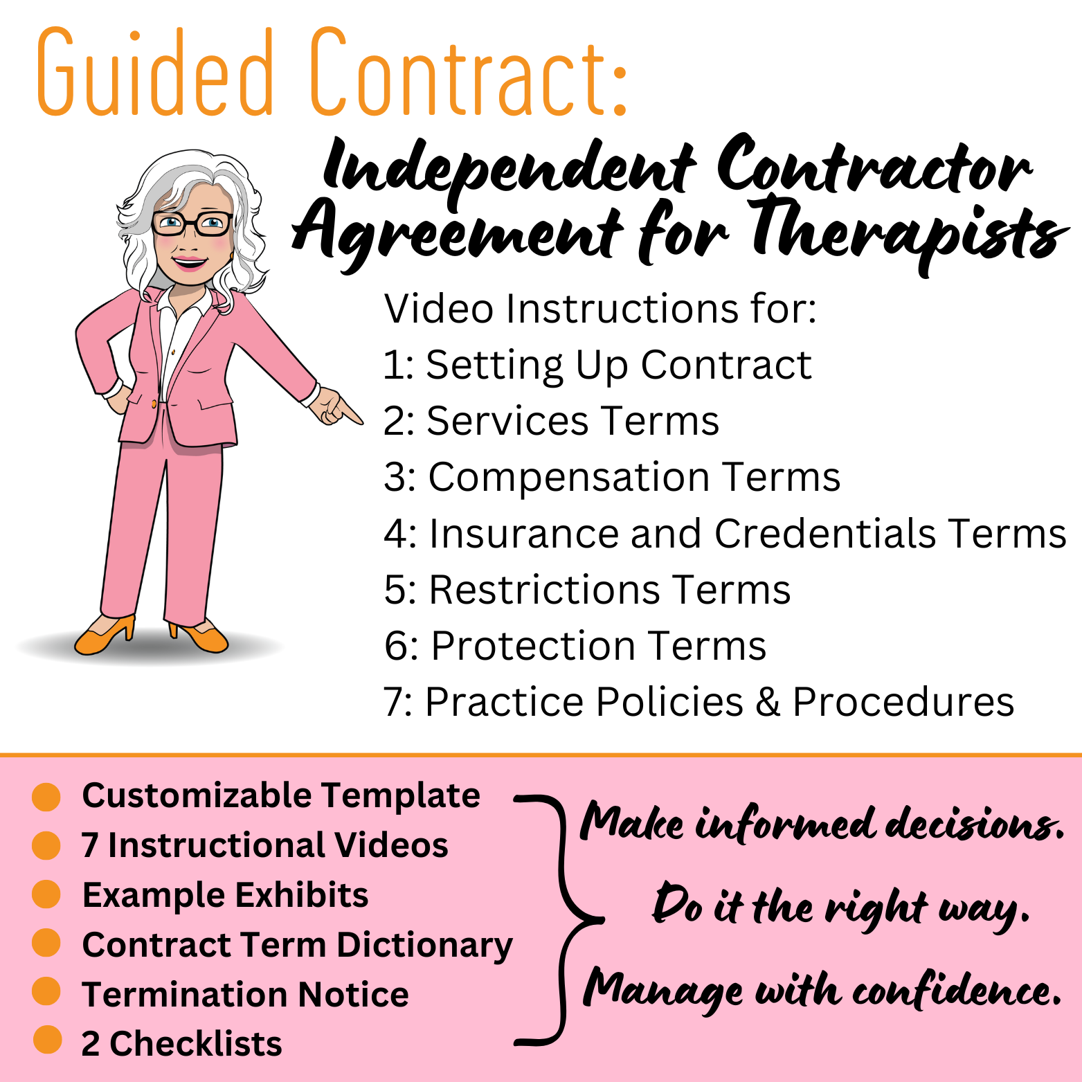 This Guided Contract: Independent Contractor Agreement for Therapist was created by an experienced business attorney (me!) who has written many of these for counseling practices. This Guided Contract is specific to your profession, unlike those general (and incomplete) templates that are floating around online.